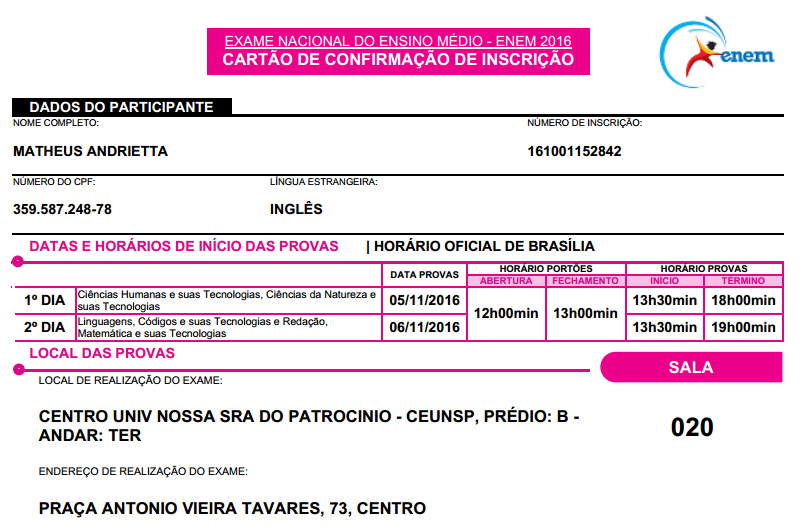 O documento contém o número de inscrição de cada participante e, apesar de não ser obrigatório, o Inep recomenda que o inscrito o leve nos dias de aplicação. O cartão também registra que o participante deve contar com determinado atendimento especializado, assim como tratamento pelo nome social, caso essas solicitações tenham sido feitas e aprovadas.