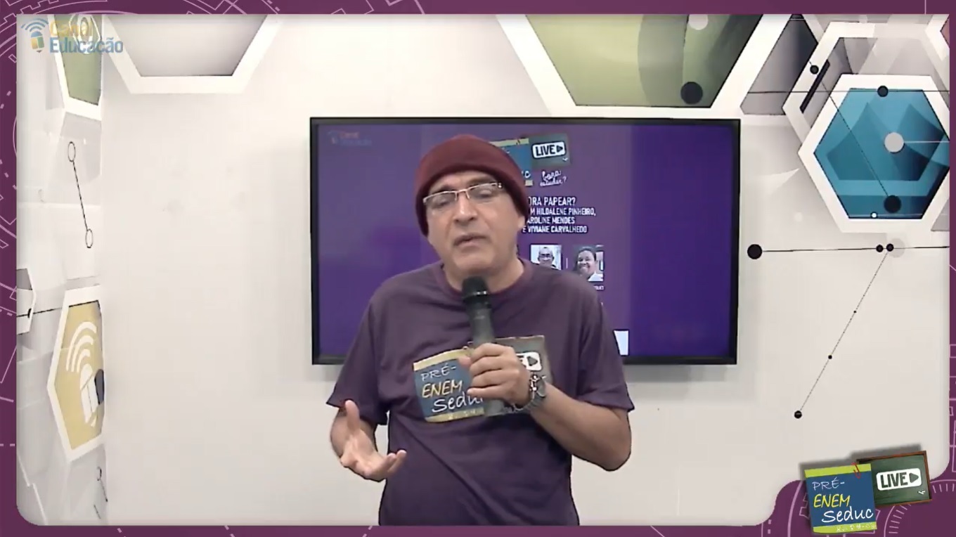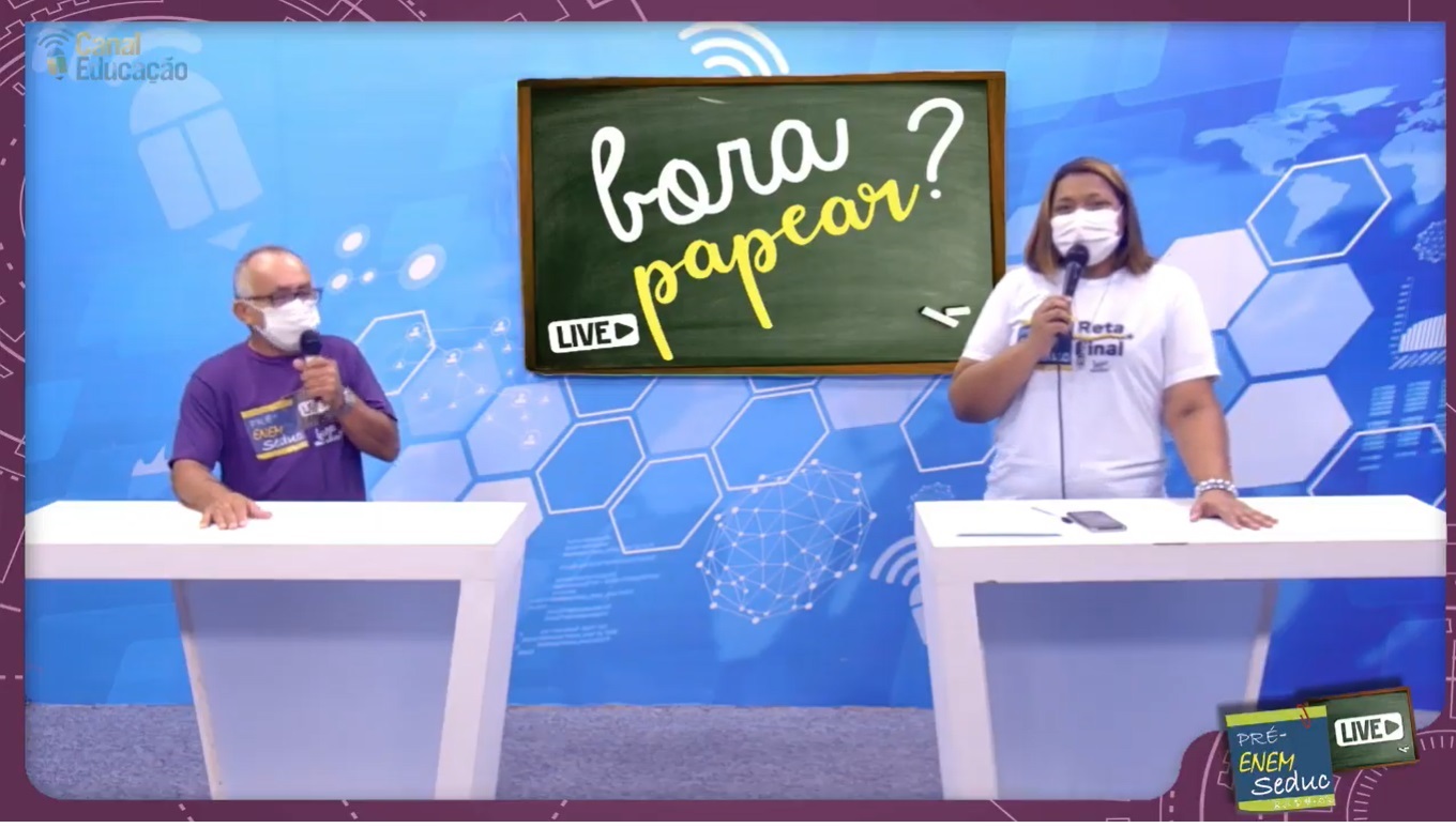 A diretora da Mediação Tecnológica da Seduc, Viviane Carvalhedo, apresentou o terceiro quadro do Bora Papear com o professor de Biologia, Tércio Câmara. Enfatizaram o peso das questões no Enem para que o estudante fique atento aos acertos que mais pontuam.