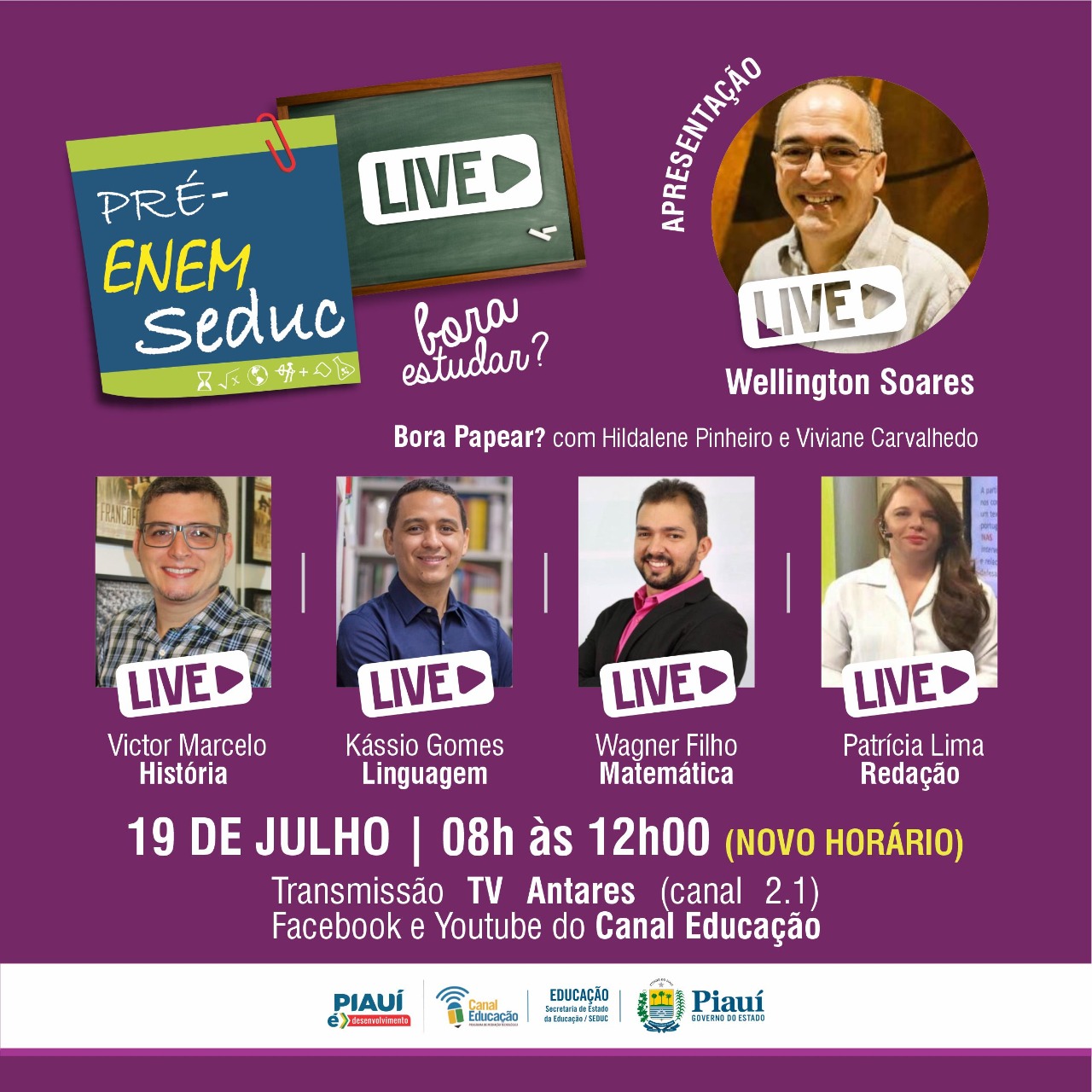 No próximo domingo (26) acontece a 14ª Revisão Pré-Enem Live. A Secretaria de Estado da Educação (Seduc) vem realizando semanalmente o aulão todos os domingos. Os encontros obedecem às recomendações de isolamento social devido à pandemia da Covid-19. As aulas acontecem de 08h as 12h de forma on-line.