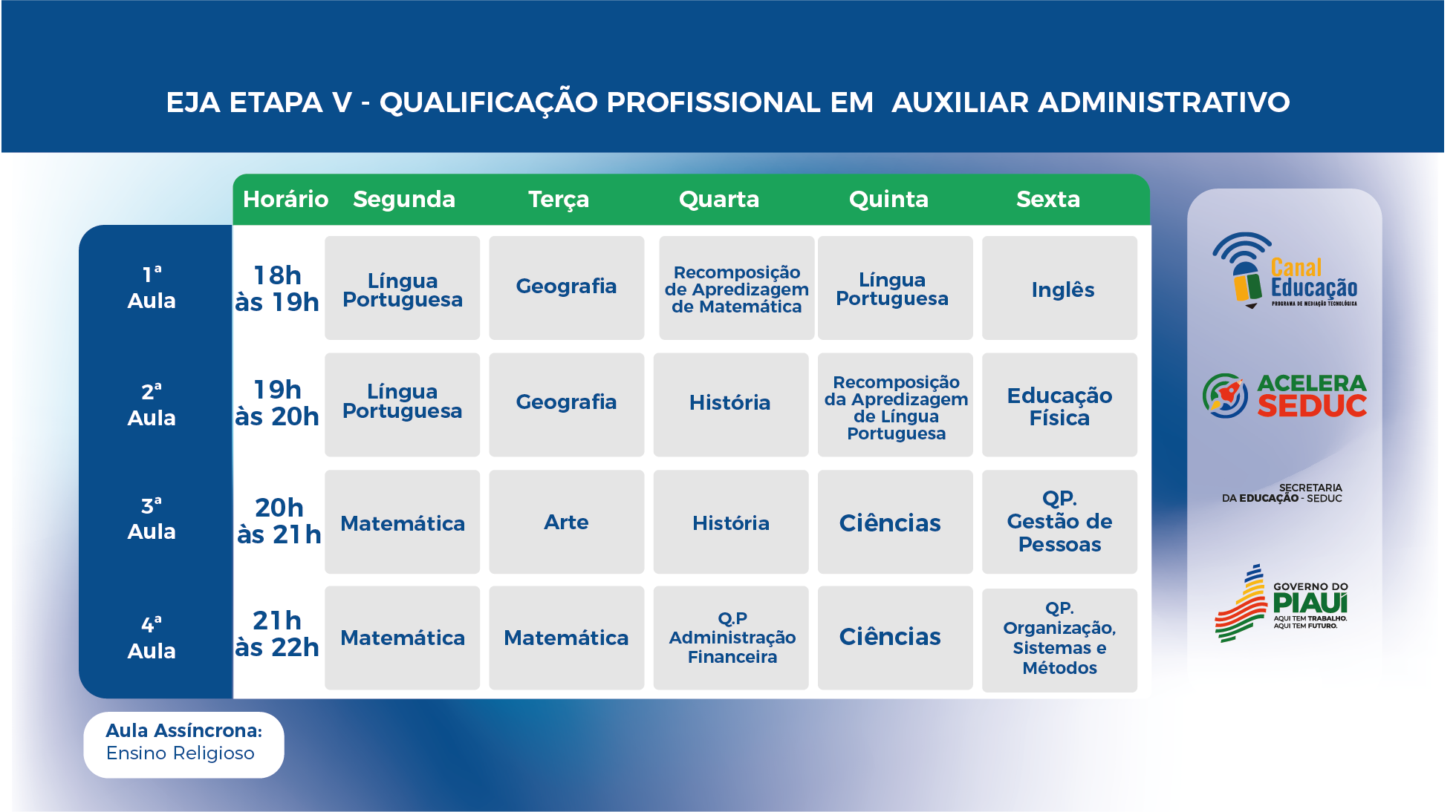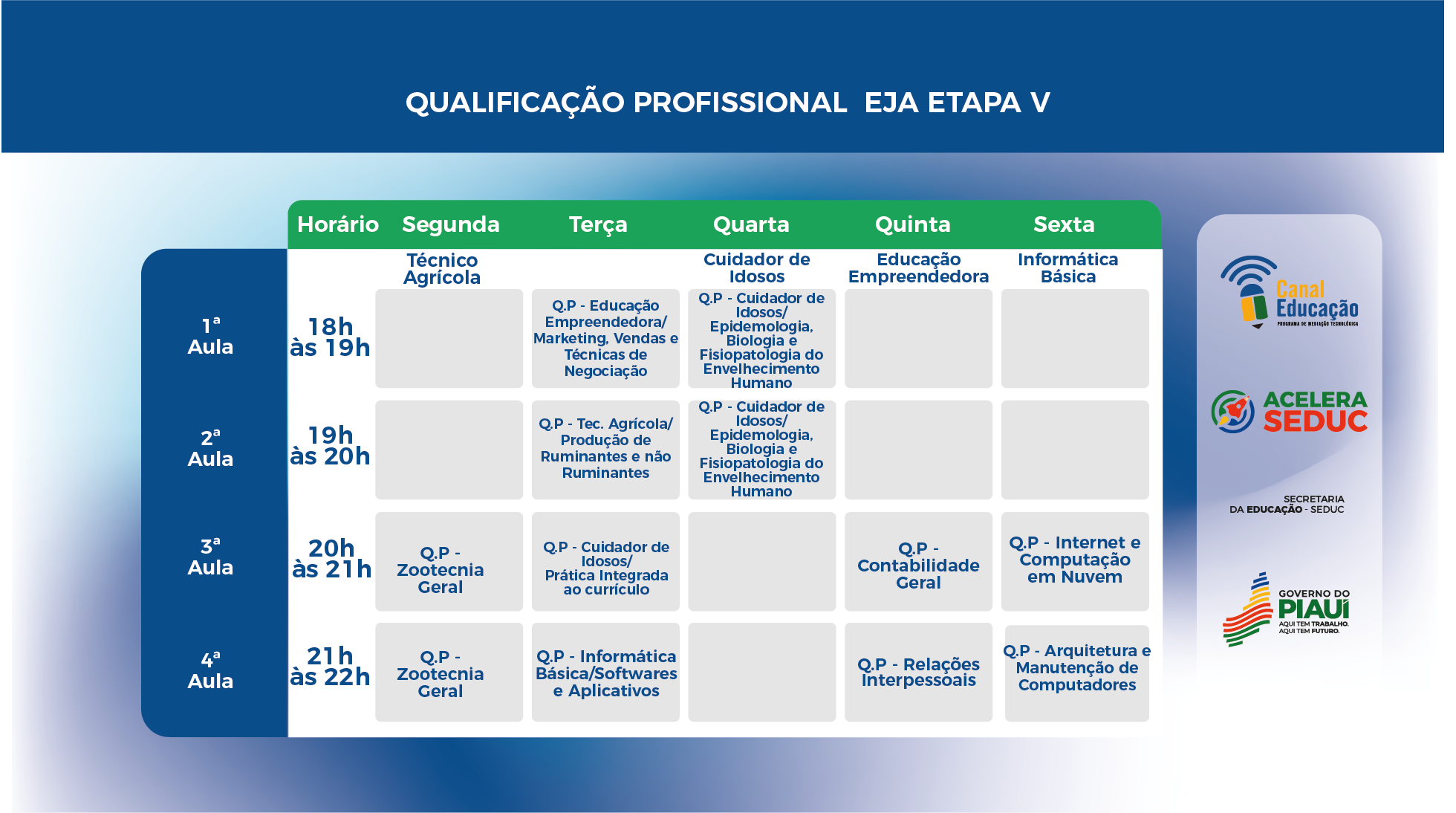 InícioMateriais PedagógicosHorário Horário EJA (Educação de Jovens e Adultos) Noite EJA (Educação de Jovens e Adultos) Etapa V EJA (EDUCAÇÃO DE JOVENS E ADULTOS) ETAPA V