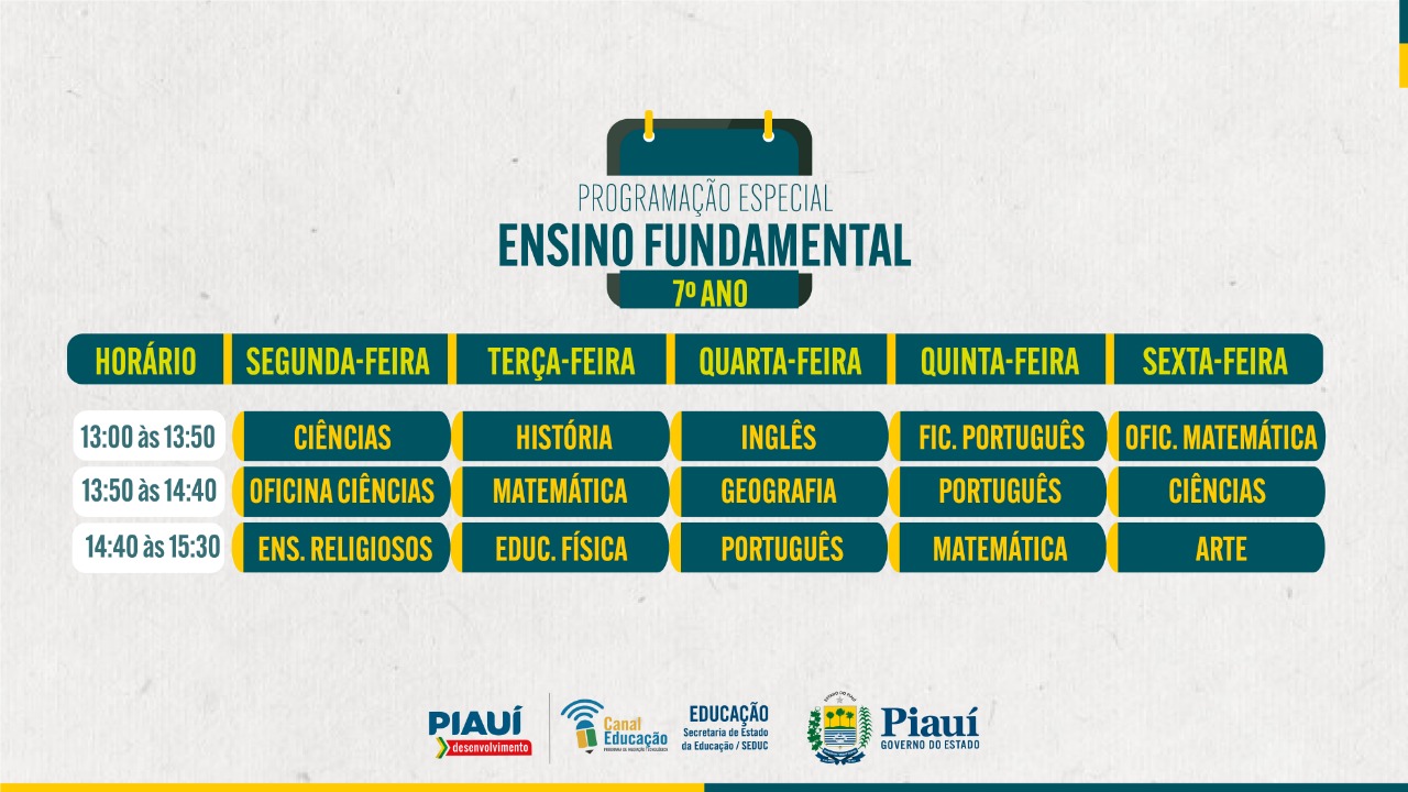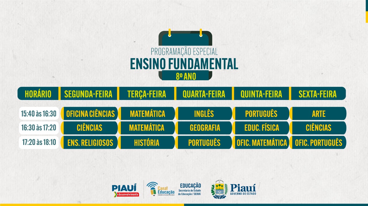 As aulas acontecem de segunda a sexta-feira a partir das 13h e encerram às 15h30. Elas serão transmitidas ao vivo pelo YouTube do Canal Educação (https://canaleducacao.tv/aulas-ao-vivo) e ficarão gravadas na plataforma www.canaleducacao.tv