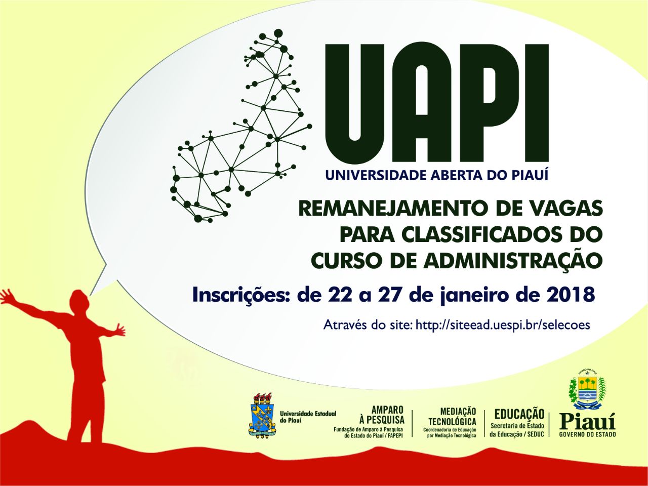 O Universidade Estadual do Piauí, UESPI, por meio da Pró-Reitoria de de Ensino de Graduação e do Núcleo de Educação a Distância - NEAD, dá início ao período de solicitações de remanejamento para o preenchimento de vagas remanescentes do Processo Seletivo Simplificado para ingresso no curso de Bacharelado em Administração 2017.2.