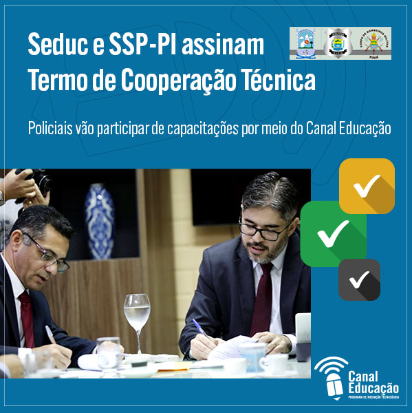 A Secretaria de Estado da Educação (Seduc) e a Secretaria de Estado da Segurança (SSP-PI) assinaram, na manhã de quarta-feira (27), o Termo de Cooperação Técnica que vai permitir que os agentes das forças policiais do Estado participem de videoconferências, transmissão de aulas e palestras em todo o Estado, por meio dos pontos de mediação tecnológica do Canal Educação.